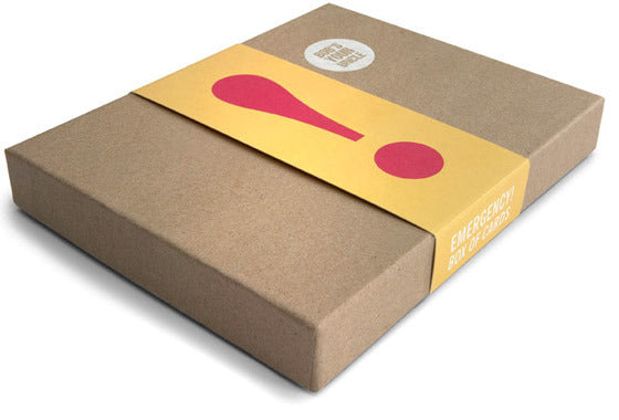An emergency box of eight assorted cards with orange envelopes for unexpected or forgotten occasions, including: birthday, wedding, new baby, thank you, congratulations, get well, bon voyage. Packaged in a kraft box.